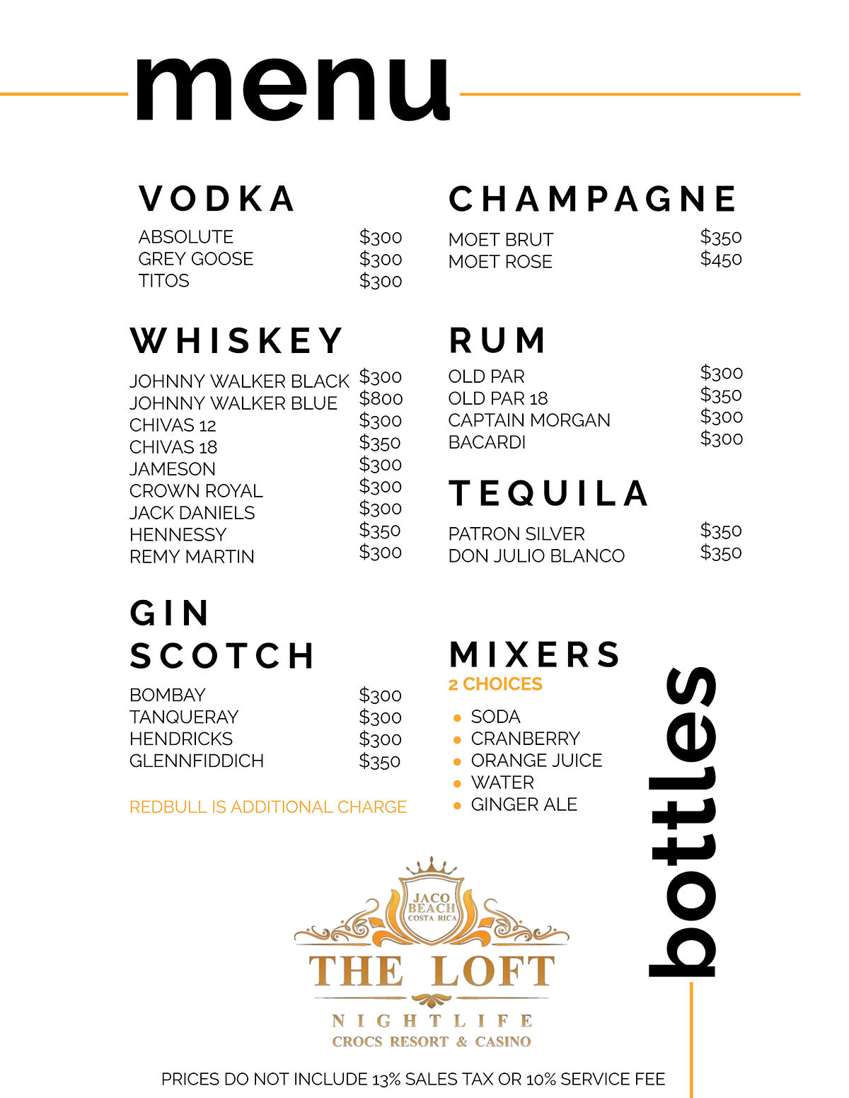 JACO NIGHTLIFE THE LOFT NIGHTLIFE JACO BEACH, COSTA RICA THE LOFT NIGHTLIFE @ CROCS RESORT & CASINO Bottle Menu VIP